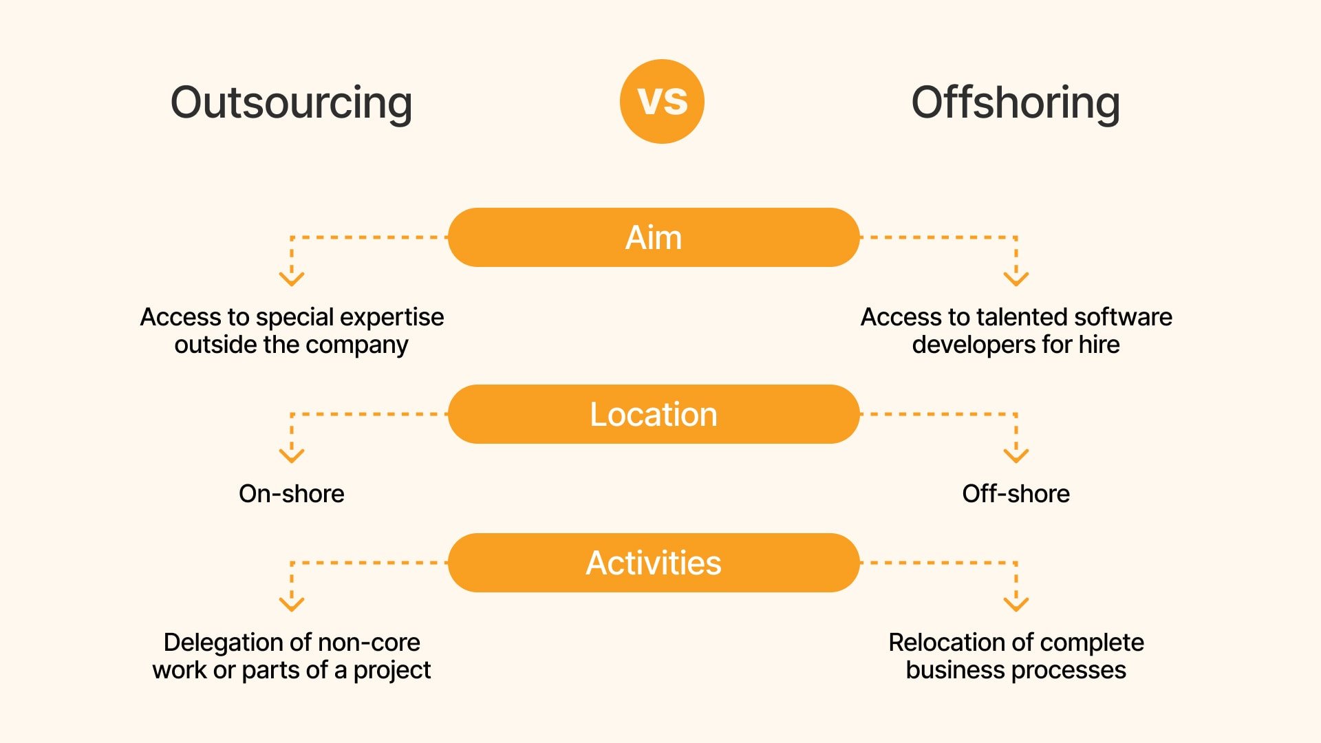 Offshoring, however, focuses on relocating entire business processes to another country, typically to take advantage of lower labor costs. While both involve external parties, the key difference lies in responsibility: in outsourcing, the client company maintains control over the project, whereas, with offshoring, they may need to set up and manage a new operation abroad.